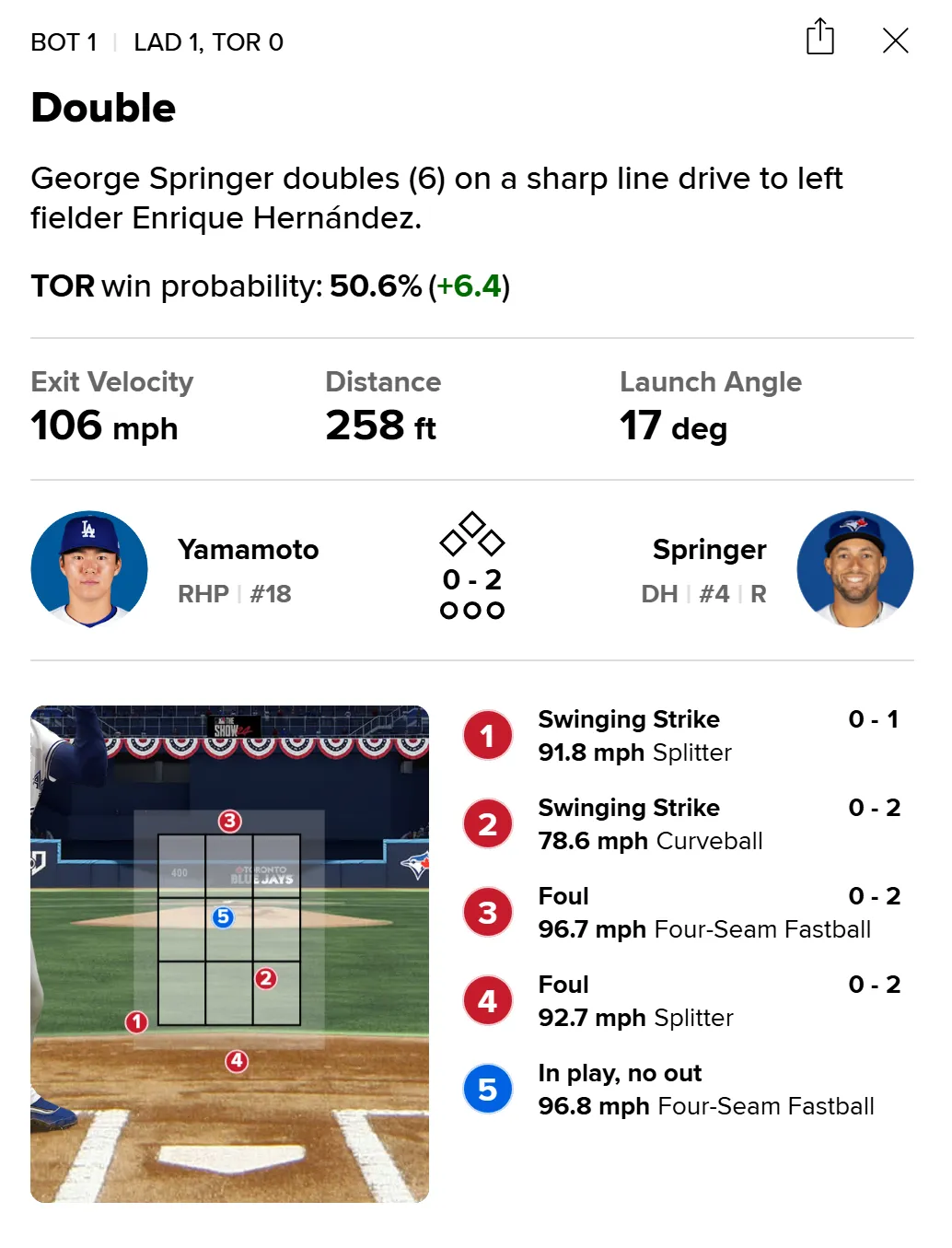 ロサンゼルス・ドジャース(0勝1敗)vs トロント・ブルージェイズ(1勝0敗)