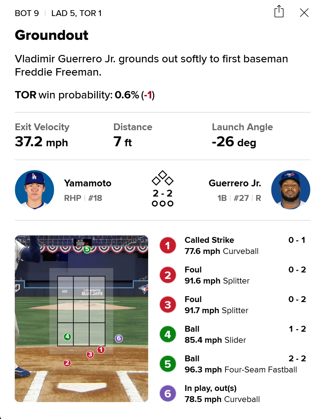 因みにスコアカード上ではブルージェイズに0.84点有利な判定をされていた。なので山本由伸の方が圧倒的不利な状況だった